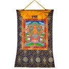 He is dark blue in colour, he looks wrathful bedecked with ornaments of serpents. He wears a garland of severed heads and a crown of five skulls symbolizing the five defilements. His right hand holds Kartri symbolizing that it can cut ego-clinging and attachemnt and his left hand hols a kapala filled with blood symbolizing the subjungation of evil ones.He wears a tiger skin symbolizing the purification of desire, He has three eyes symbolizinng his clear comprehension of three times. He looks ferrocious against the blazing fire. His mouth is smeared with blood signifying that he is active in eliminating evils. One attribute he holds a bundle of tent poles, he is also the protector of Mongolia and protector of tents.
